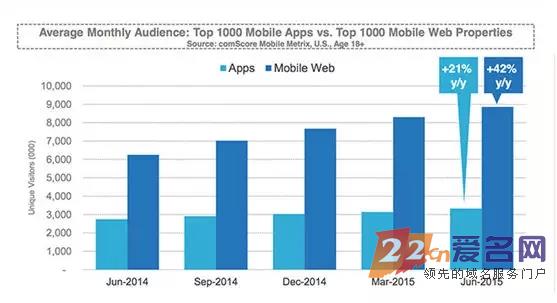 根据康姆斯科公司最新的移动报告数据,移动网站正在呈现爆炸式增长,比APP软件的流量增速平均快两倍。报告显示,月访问量前1000名网站的用户数量由一年前不到600万增长至900万。我们可以做一个猜想,也许过不了多久,APP即将被“移动网站”这一后浪拍死。移动网站的增长,势必会带动域名行业的发展。