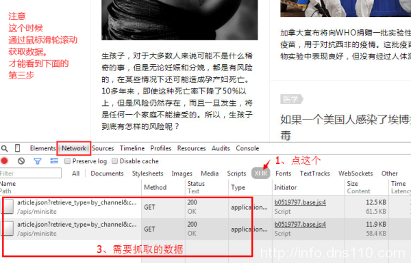 在目标页面按F12或Ctrl+Shift+C打开审查元素,然后点Network选项卡,通过下滑的操作实时监控Network中出现的链接。