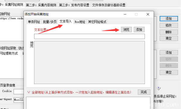 新建一个采集任务,然后将保存的TXT导入,然后依次进行采集,后面的工序就不说了,和分页采集的步骤是一样的。
