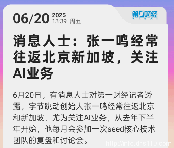 有消息称,字节跳动创始人张一鸣目前主要办公地已从新加坡转到北京,从去年下半年开始,他每月会召集一次字节核心管理层和AI项目负责人的复盘和讨论会。6月20日,知情人士表示,张一鸣一直很关注AI业务。目前张一鸣经常往返北京和新加坡,从去年下半年开始,他每月会参加一次seed核心技术团队的复盘和讨论会。