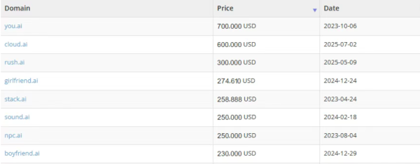 值得注意的是,这笔交易不仅是 2025 年目前的 .AI 域名交易冠军,同时也以 60 万美元的成交价跻身 .AI 域名历史成交价第二位,仅次于 2023 年 You.ai 创下的 70 万美元纪录。Cloud.ai 能否最终摘得 2025 年度桂冠,还需观望下半年市场是否会出现更重磅的交易。